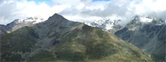 Blick von unterhalb der Ortler-Nordwand auf Sulden, Vorderes und Hinteres Schöneck und auf die Tschenglser Hochwand (h.l.)